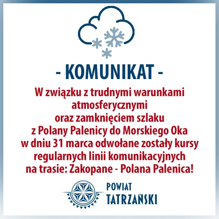 Starostwo Powiatowe w Zakopanem poinformowało, że tego dnia nie pojadą regularne autobusy na trasie Zakopane – Polana Palenica. Powodem są trudne warunki atmosferyczne oraz zamknięcie szlaku prowadzącego z Polany Palenicy do Morskiego Oka.