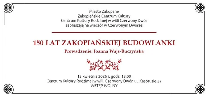 Spotkanie pt. „150 lat zakopiańskiej Budowlanki” odbędzie się 13 kwietnia 2026 roku o godz. 18.00 w willi Czerwony Dwór w Zakopanem. Organizatorem wydarzenia są Miasto Zakopane, Zakopiańskie Centrum Kultury oraz Centrum Kultury Rodzimej w willi Czerwony Dwór. Prelekcję poprowadzi Joanna Wajs-Buczyńska, a na sali nie zabraknie spojrzenia na szkołę, która przez dekady rosła razem z miastem.