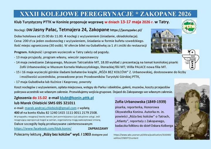 Zakopane na kilka dni zamienia się w przestrzeń dla miłośników górskich spacerów i literackich tropów — będzie trochę muzeów, wieczorny wykład i kilkudniowe wędrówki po szlakach inspirowanych powieścią RÓŻA BEZ KOLCÓW Zofii Urbanowskiej. Warto wpaść!